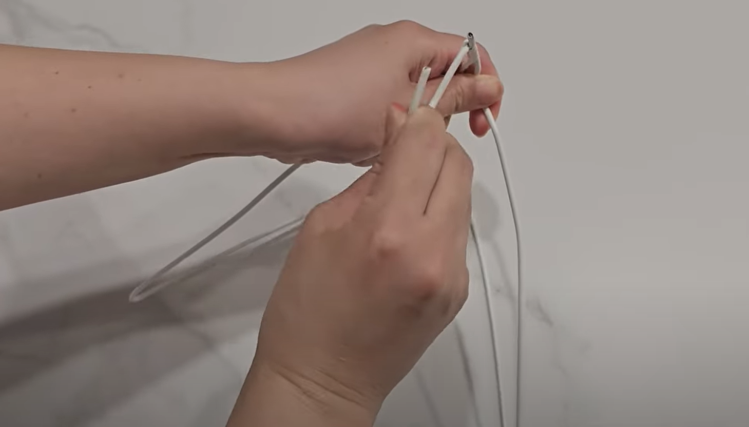 우선, 옷걸이를 보시는 것처럼 반으로 접어주고 고리 부분을 같은 방향으로 꺾어주세요. 이렇게 하면 바나나 걸이가 완성됩니다. 그럼 이렇게 해서 그냥 바나나를 걸어주면 되느냐? 그렇지 않습니다.
