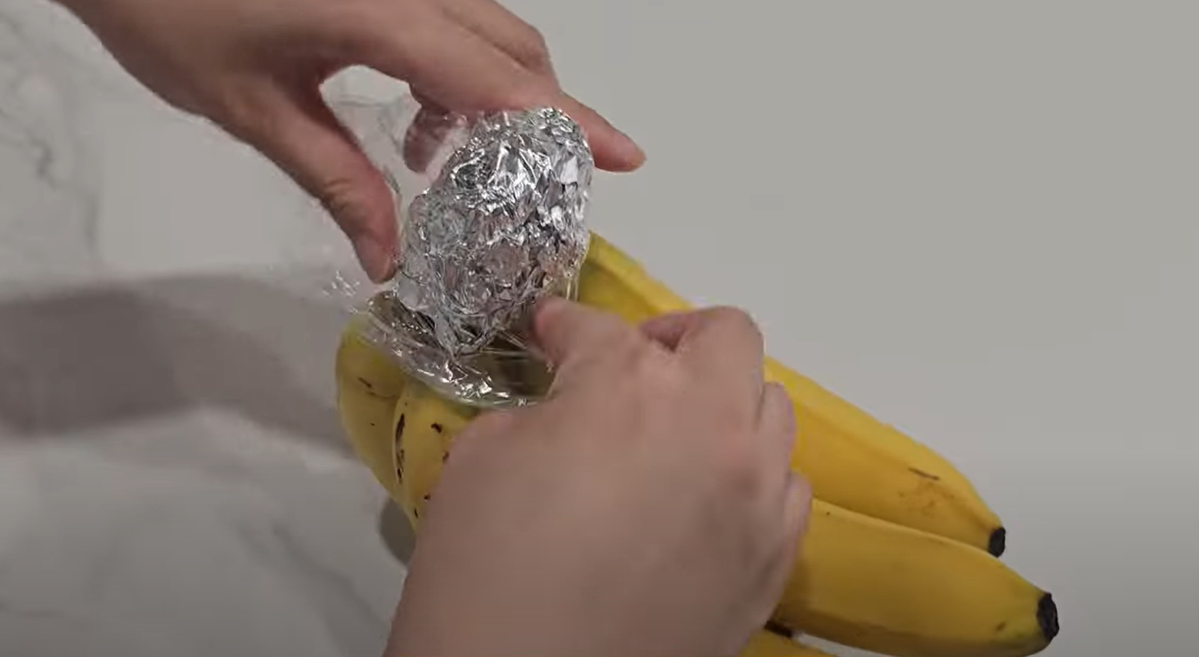 아래의 사진에서 보시는처럼 에틸렌 가스가 배출하는 바나나 꼭지 부분을 호일이나 비닐랲으로 감싸줄텐데요.