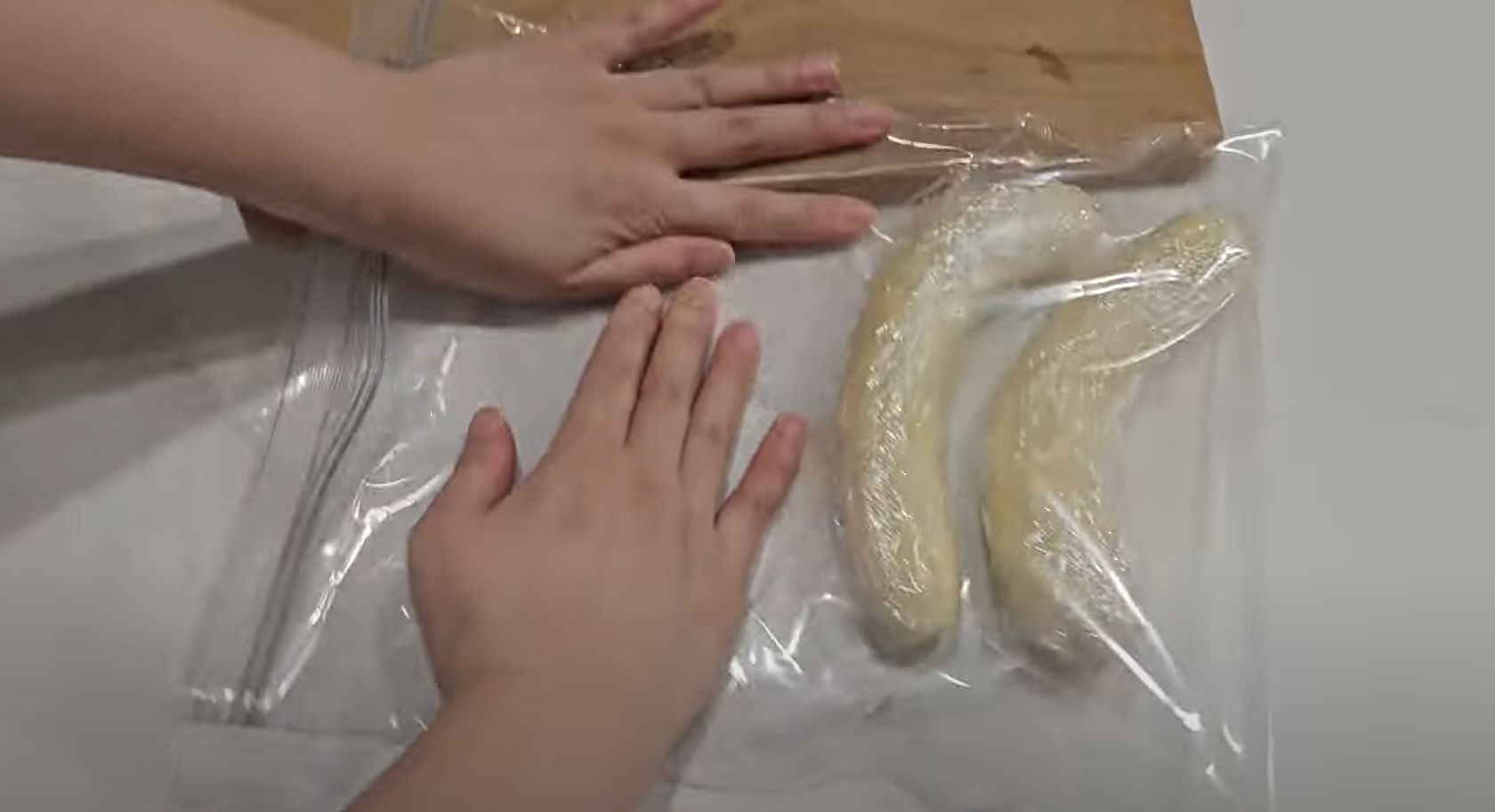 먼저 바나나 껍질을 모두 까주도록 합니다. 그리고는 비닐랲으로 하나씩 감싸주는데요.
