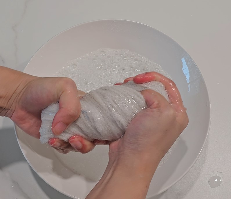 베이킹소다 물에 충분히 담궈준 후에 물기를 잘 짜주면 되겠습니다.