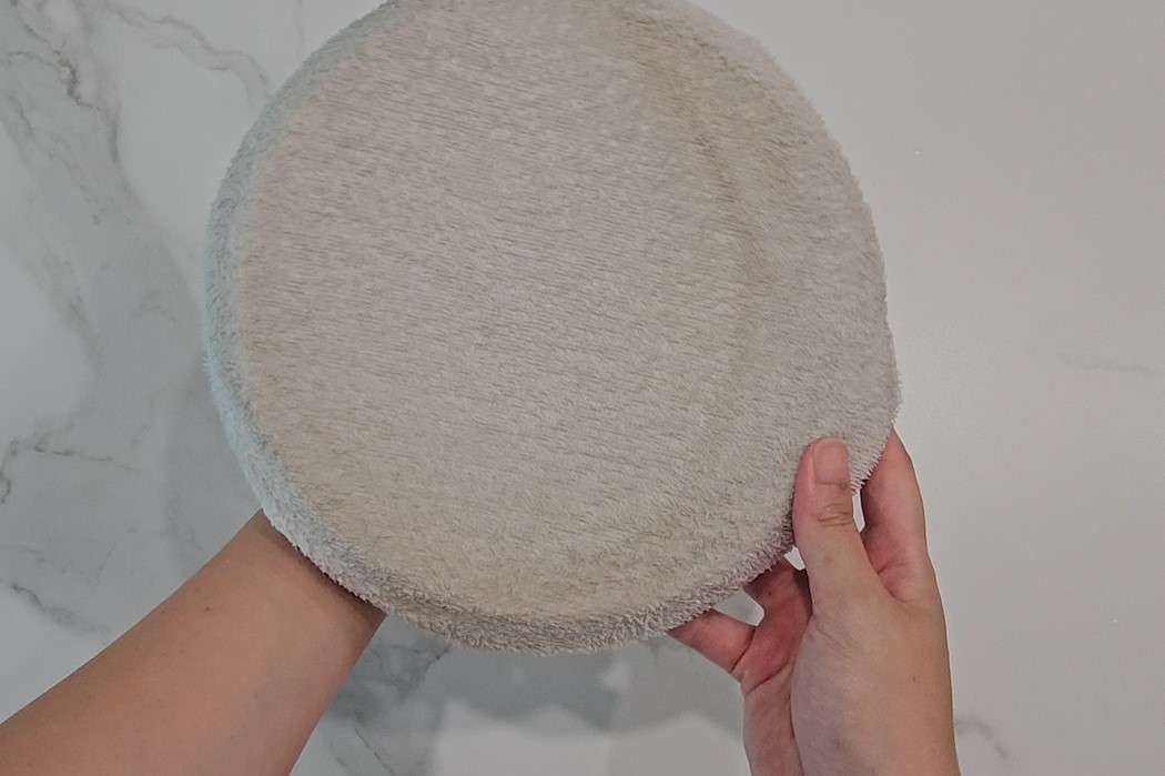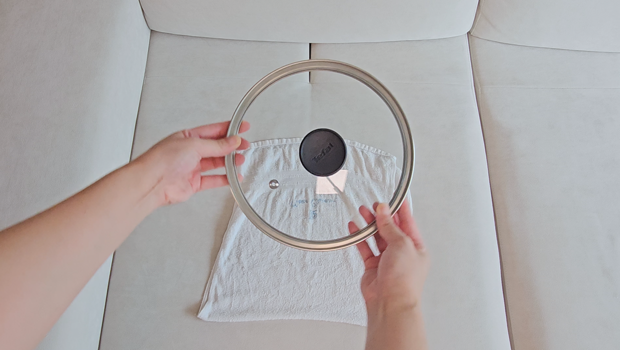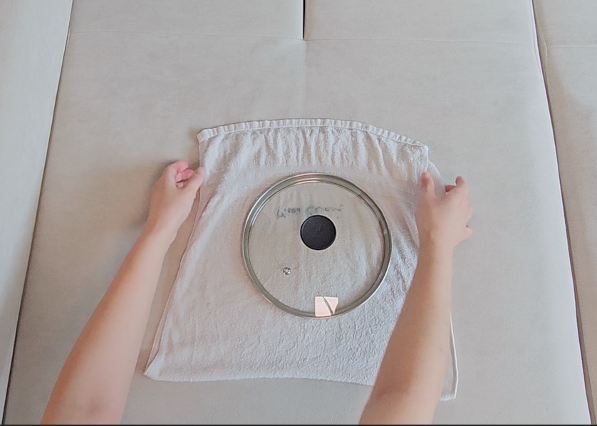 이제 냄비 뚜껑을 수건 가운데 놓은 뒤 수건을 중간으로 잘 감싸줍니다.