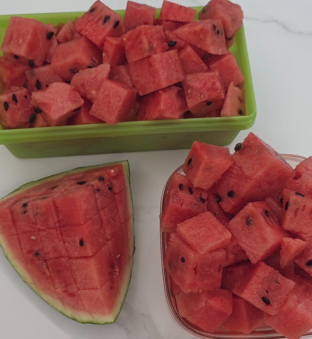 냉장고에 통째로 둔 수박을 그대로 두면 안 돼요! 시간이 지나면 아삭함은 사라지고 물러져버린답니다. 자른 즉시 적절히 보관하는 것이 중요해요.