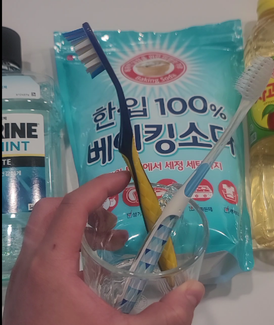 이 칫솔 살균과 관련하여 실험을 하였는데, 식초, 구강청결제 베이킹 소다를 증류에 각각 1%씩 희석하여 칫솔을 담궈놓은 실험이었습니다.