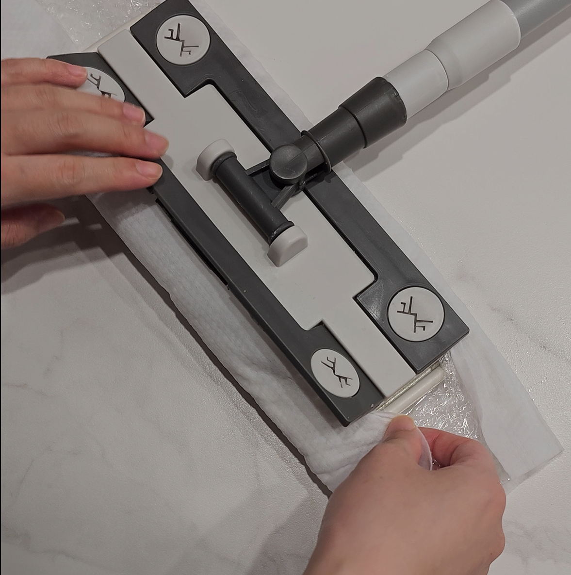 위의 사진에서 보시는 밀대걸레는 고정하는 방법이 2가지 모두 있는 제품인데요. 저는 덮개 뚜껑을 열어 끼우는 방식으로 해보았습니다. 이렇게 청소포와 뽁뽁이를 함께 끼워 걸레질을 꼭 해보시기 바랍니다.