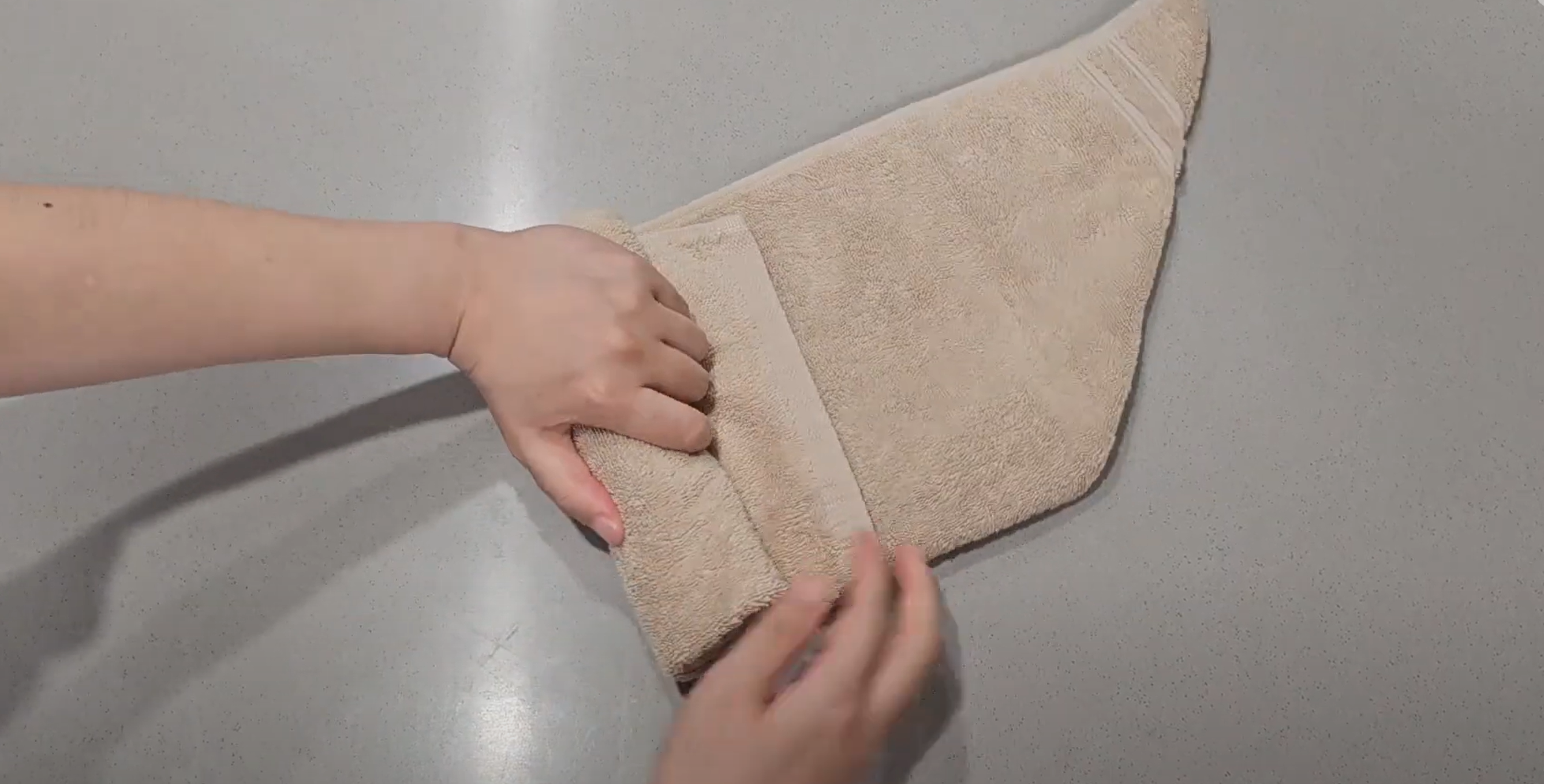 그리고 수건을 살짝 비틀어서 위에서 아래로 반 접어줍니다. 오른쪽 면을 삼각형 모양이 나오게 접고 반대쪽 면은 남은 부분에 맞춰서 접어줍니다. 마지막으로 사각형 모양으로 한 번 접은 후 반대쪽 틈에 끼워주면 끝입니다. (맨 아래의 링크에서 영상 참고)