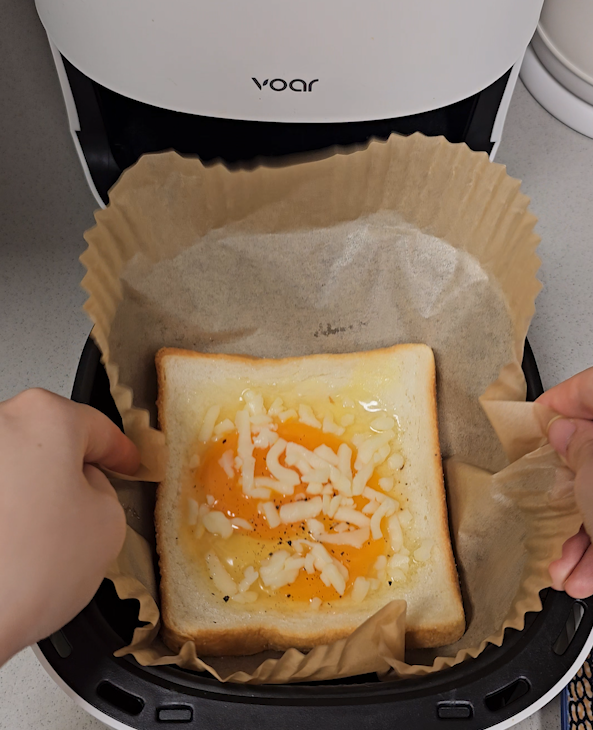 식빵, 버터, 후추, 설탕, 계란, 모짜렐라 치즈, 숟가락, 전자레인지, 에어프라이어