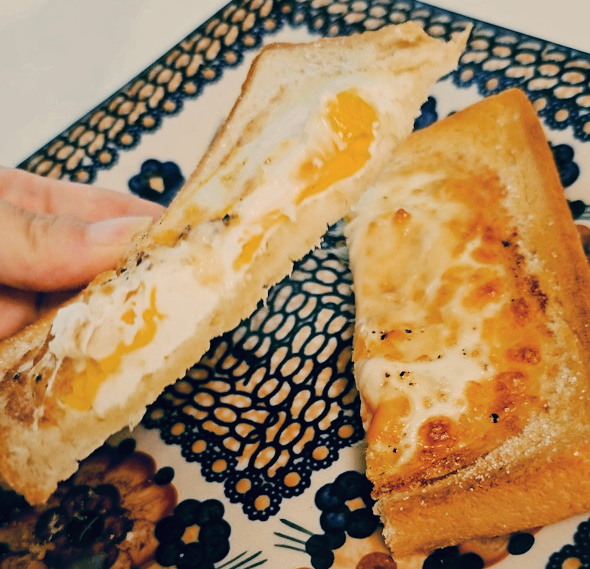 식빵, 버터, 후추, 설탕, 계란, 모짜렐라 치즈, 숟가락, 전자레인지, 에어프라이어
