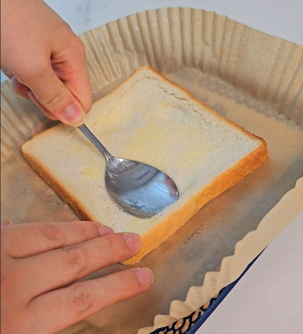 2) 숟가락으로 식빵을 눌러줍니다.