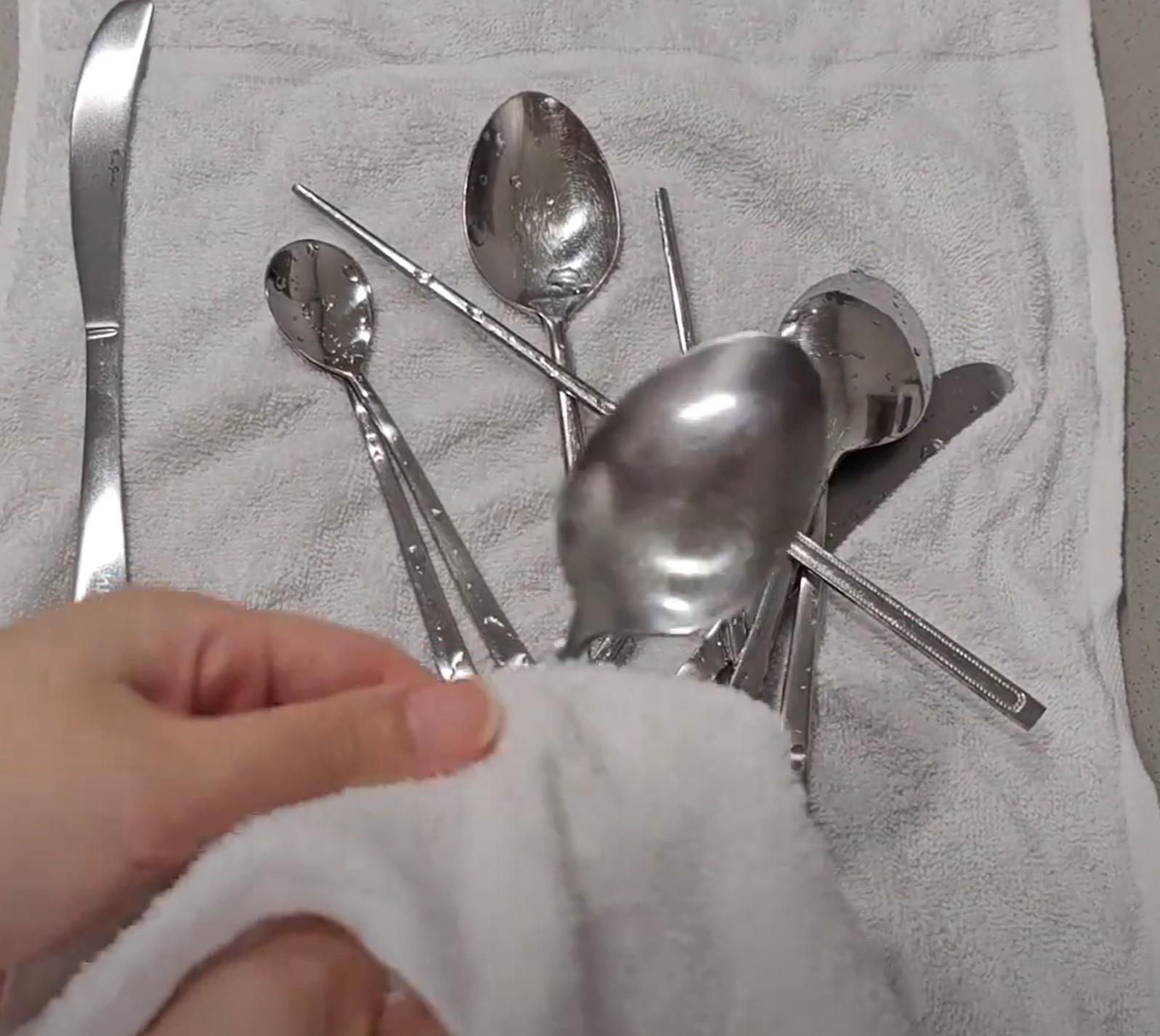 이제 수저를 꺼내고 흐르는 물로 식혀주기만 하면 되는데요. 충분히 식혔다면 마른 타월로 닦아주면 완전히 완료입니다.