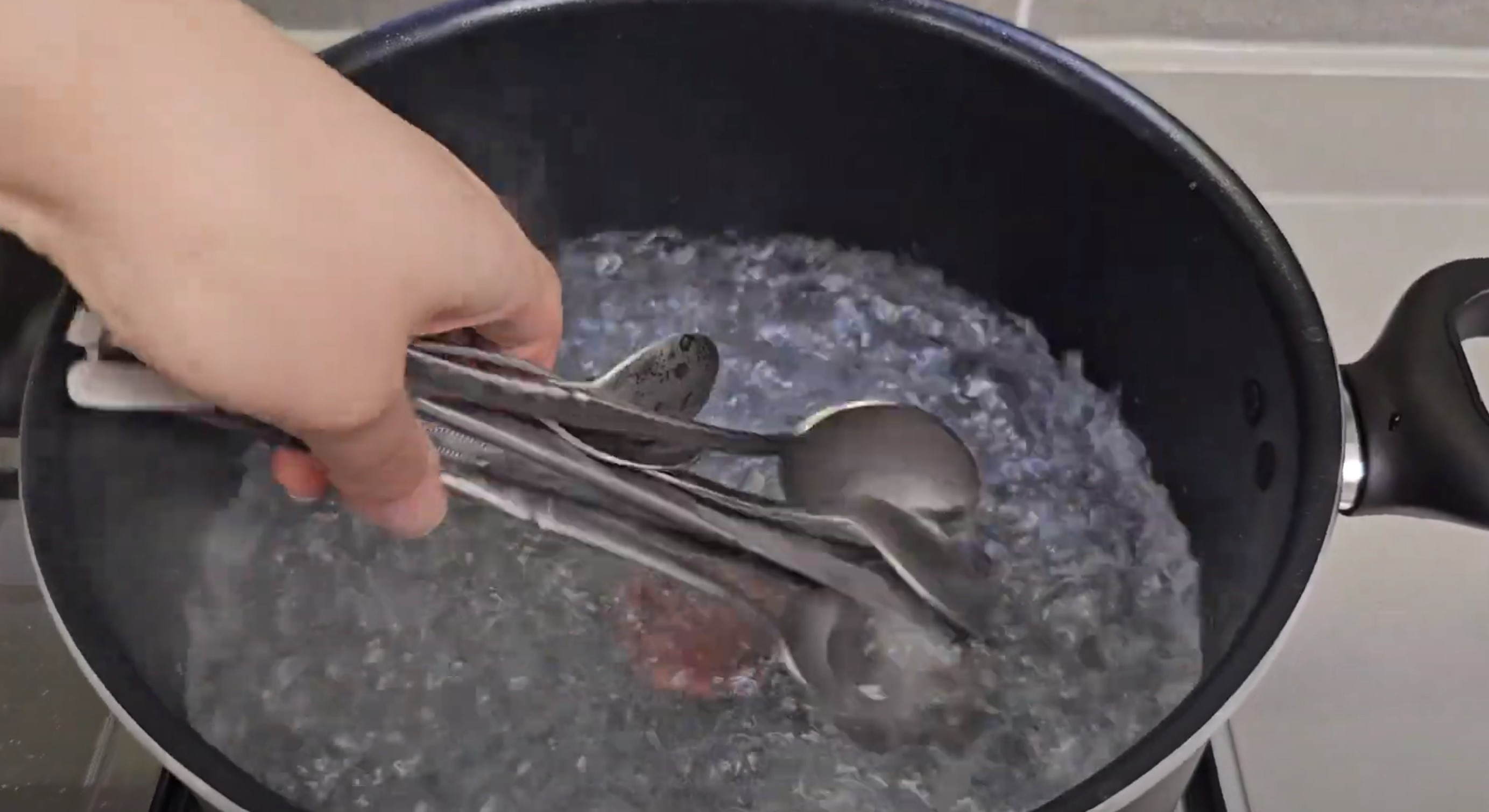 이제 수저를 꺼내고 흐르는 물로 식혀주기만 하면 되는데요. 충분히 식혔다면 마른 타월로 닦아주면 완전히 완료입니다.