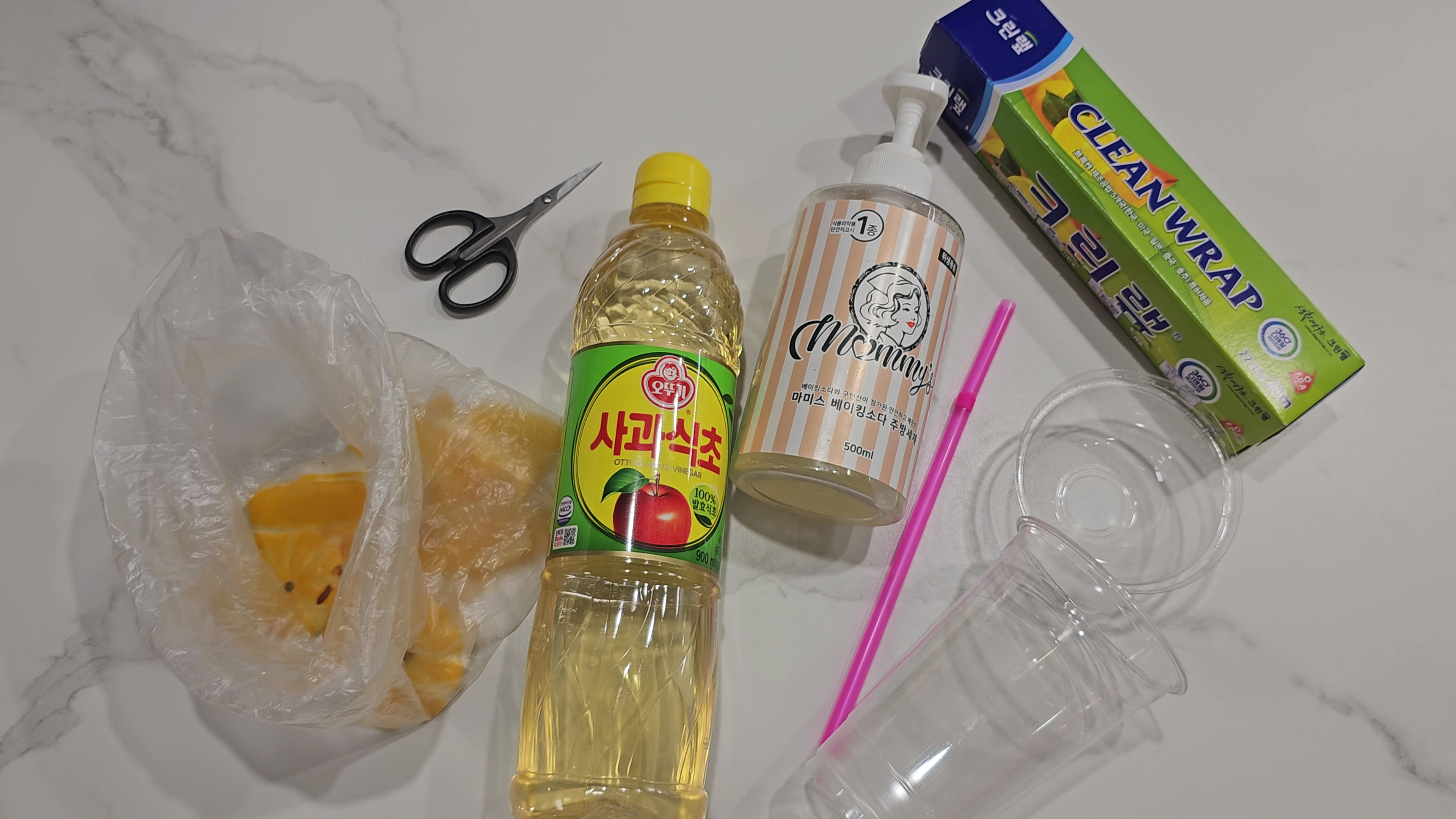 준비물은 일회용컵, 빨대, 물과 주방세제, 비닐랩, 그리고 과일껍질과 식초를 준비해줍니다.