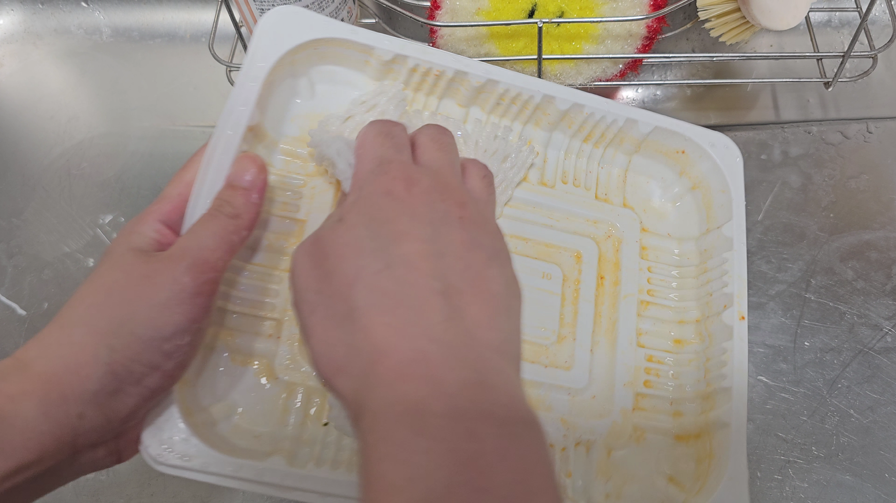 2. 배달음식 먹고난 후 심하게 묻은 용기 닦을 때 일회용 수세미로 활용하기