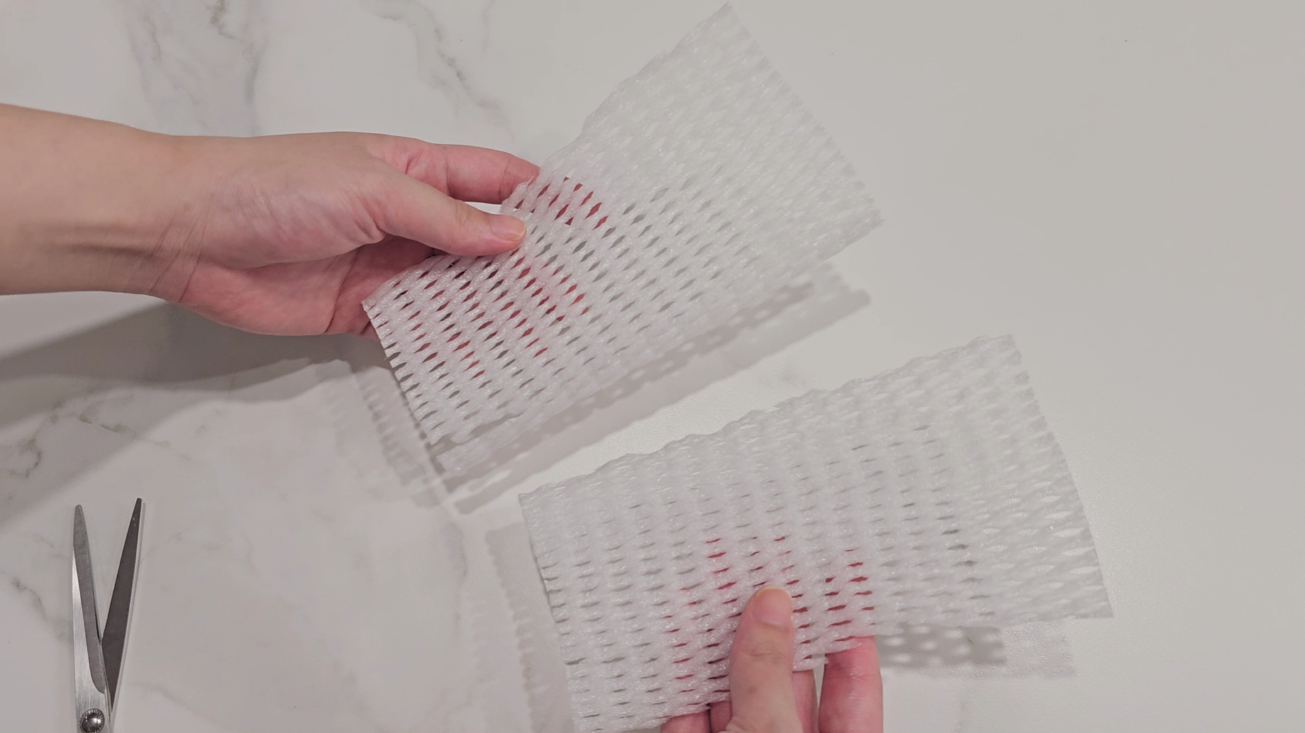 과일망을 각각의 용기 크기에 맞춰주고 이렇게 끼워준 뒤 고무줄로만 고정해주시면 되는데요. 이렇게만 해줘도 깔끔하게 기름 흐르는 것도 방지되고, 용기가 미끌거리지 않아 아주 유용하답니다!