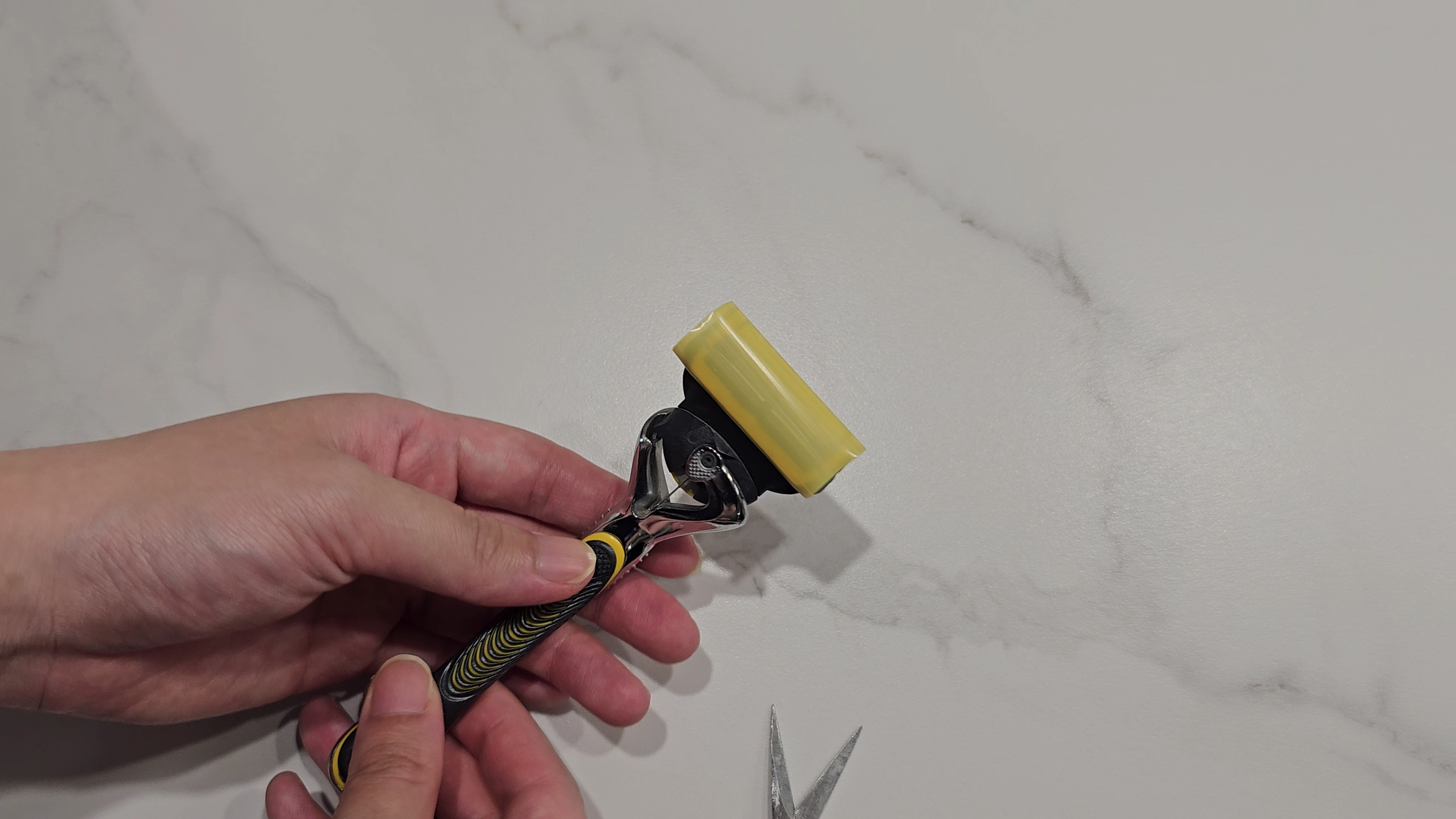 빨대를 면도기 길이만큼 잘라주고 반을 갈라서 면도기에 끼워주면 면도기캡이 완성!